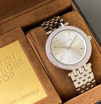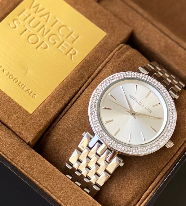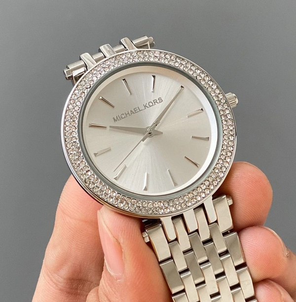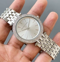 *A turquoise mother-of-pearl dial trimmed in pavé crystals adds feminine sparkle to the glamorous stainless-steel Michael Kors Darci watch.*
