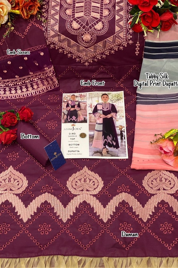 *💖Superhit Desgin in Singles & Multiples💖* *💕ASIM JOFA™️💕* *💫Design - *56058 D* *Exclusive Cotton Collection"* 👇🏻Fabric details👇🏻 🔺Top:Lawn Cotton with Hevy Embroidery with Cutwork Daman 🔺Sleeves:Embroidered 🔺Bottom:Lawn Cotton 🔺Dupatta:- SIFFON DIGITAL PRINT